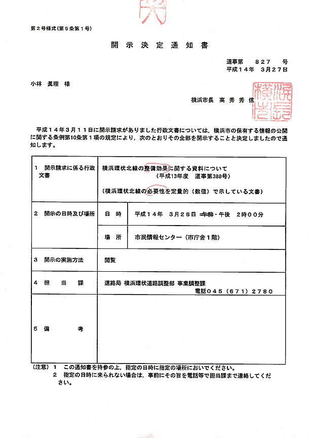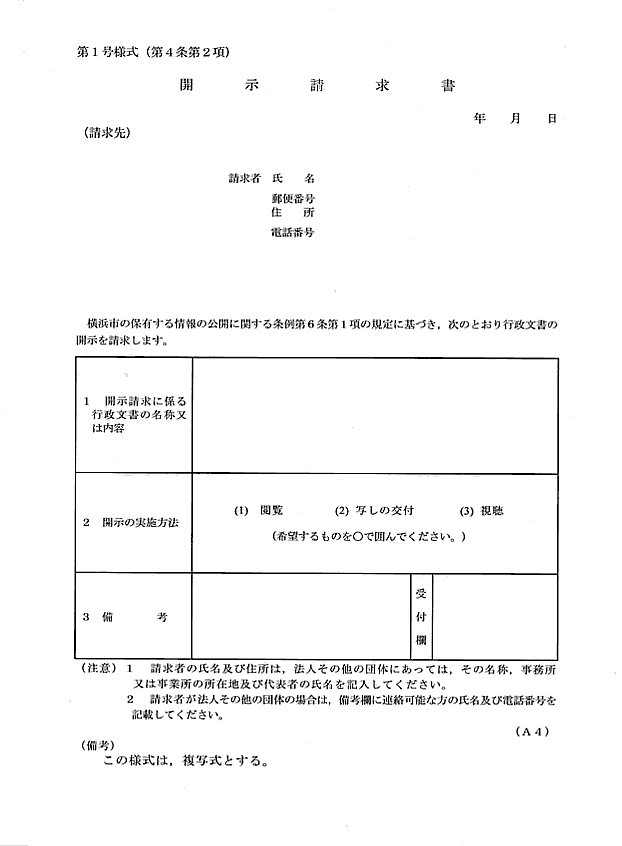 請求文書が決まったら、窓口で「開示請求書」というものをもらい、それに日付、氏名、郵便番号、住所、電話番号、請求する文書の内容(=「横浜環状北線の必要性を定量的(数値)で示している文書」)を書き込みます。そして、文書が開示された場合の実施方法を選んだら、後はその紙を窓口に提出するだけです。