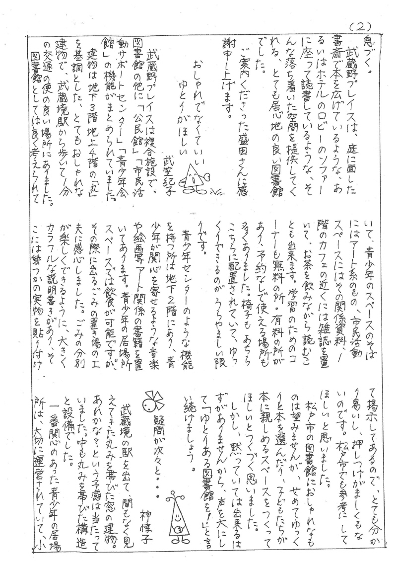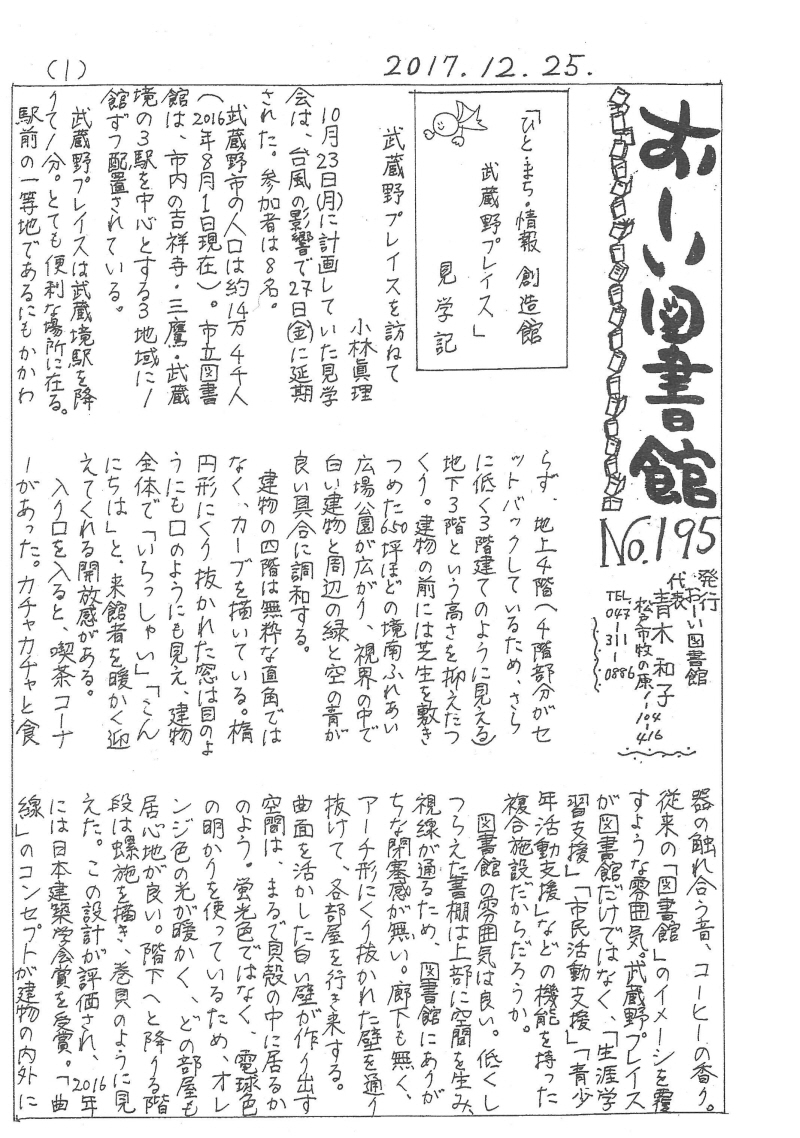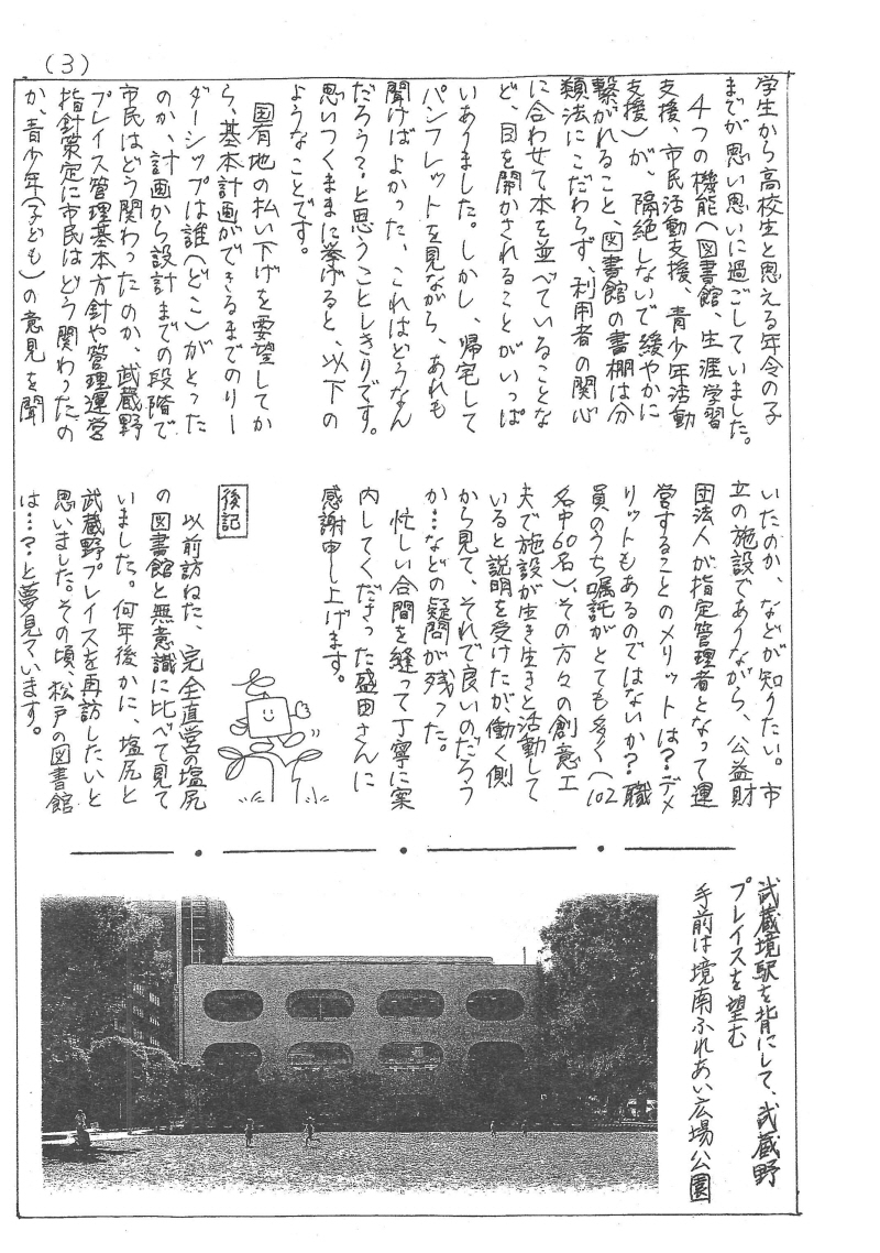 武蔵野プレイスを訪ねて 小林眞理 / おしゃれでなくていい、ゆとりがほしい 武笠紀子 / 疑問が次々と… 神惇子 / 編集後記/武蔵野プレイス写真 / 武蔵野プレイスフロア構成図