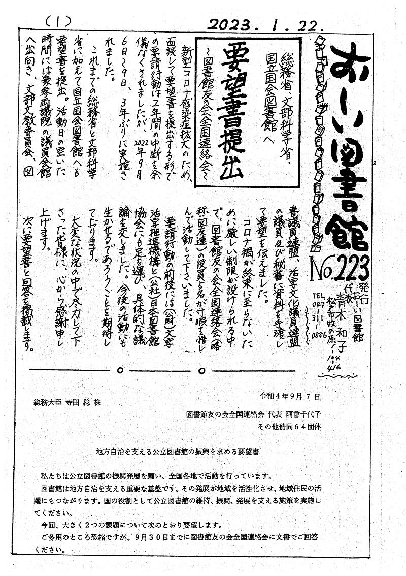 総務省、文部科学省、国立国会図書館へ「要望書提出」