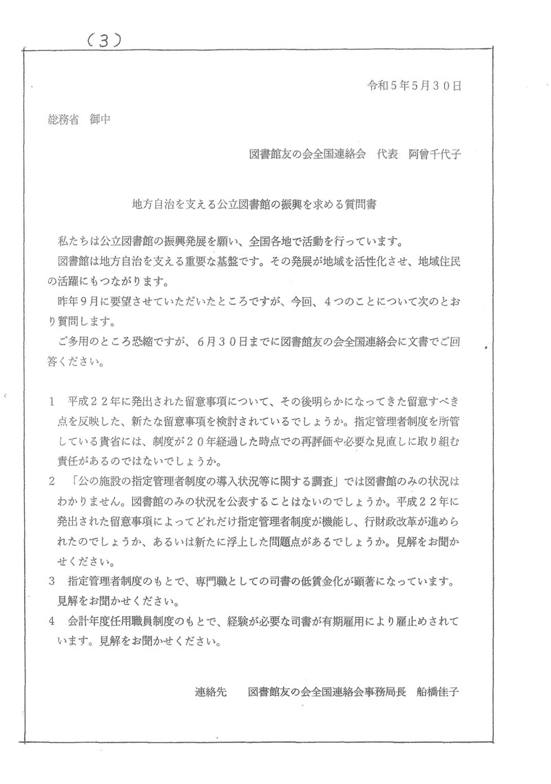 地方自治を支える公立図書館の振興を求める質問書:総務省御中